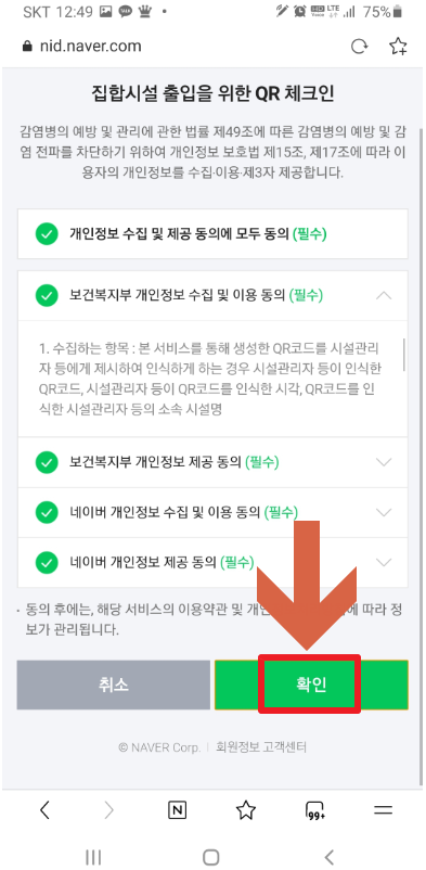 qr체크인을 클릭 하고 들어 가면 개인정보 수집 동의를 한후 확인을 클릭해 주세요. 처음 접속 했다면 휴대폰 인증 화면이 나오는걸 확인 할수 있습니다.