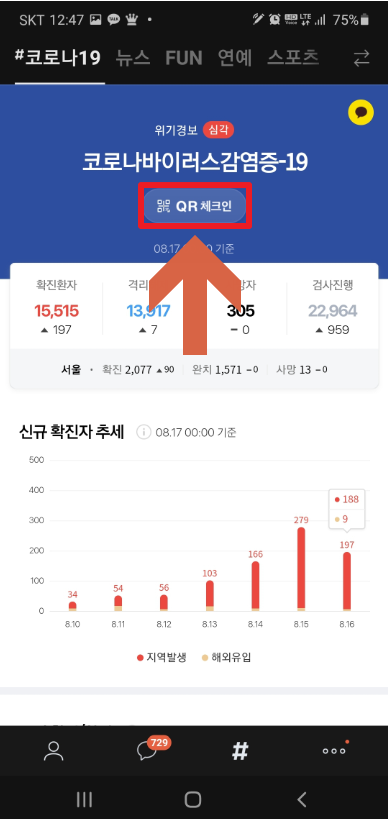 클릭 하고 들어 가면 코로나 전국 발생 현황을 볼수 있고 위쪽에 qr체크인이 있습니다. 클릭해 주세요. 개인정보 동의를 클릭하는 화면이 나오고 체크후 동의를 클릭해 주세요.