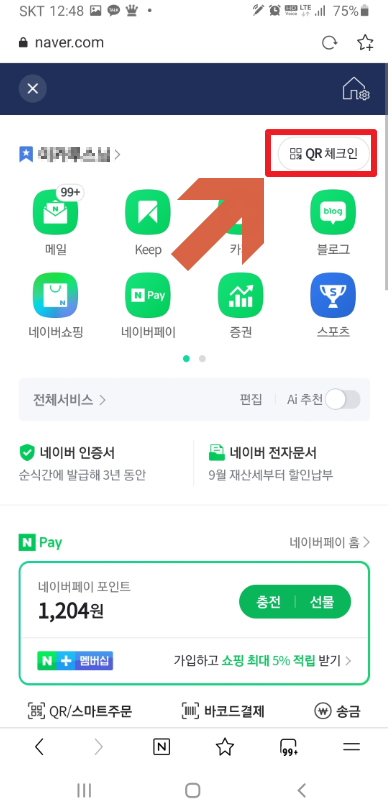 스마트폰 에서 네이버 웹을 실행 시킨후 왼쪽 위에 있는 메뉴 버튼을 클릭 하거나 오른쪽 위에 있는 프로필을 클릭해 주세요. 클릭 하고 들어 가면 오른쪽 위를 보면 qr체크인이 있는걸 확인 할수 있습니다. 클릭해 주세요.