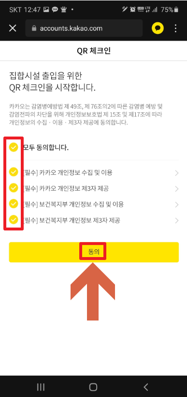 qr체크인을 클릭 하고 들어 가면 개인정보 수집 동의를 한후 확인을 클릭해 주세요. 처음 접속 했다면 휴대폰 인증 화면이 나오는걸 확인 할수 있습니다.