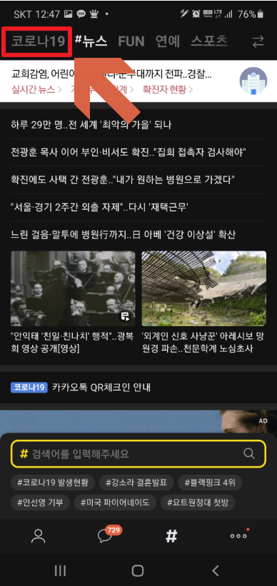 카카오톡을 실행후 아래쪽에 있는 샵버튼을 클릭해 주세요. 클릭 하고 들어 가면 위쪽에 코로나19가 있습니다. 클릭하고 들어가 주세요.