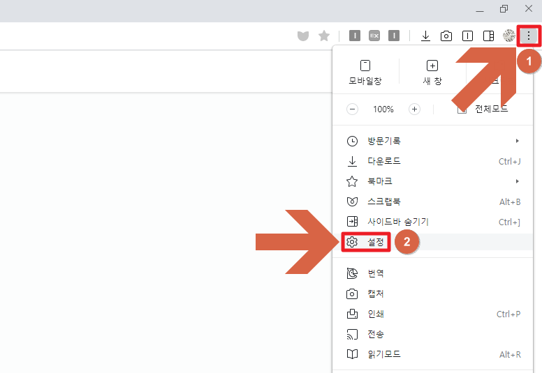 네이버 웨일 에서도 설정 하는 방법은 간단 합니다. 웨일을 실행 시킨후 오른쪽 위를 보면 실행 버튼이 있습니다. 클릭 하면 설정이 있으니 클릭해 주세요.