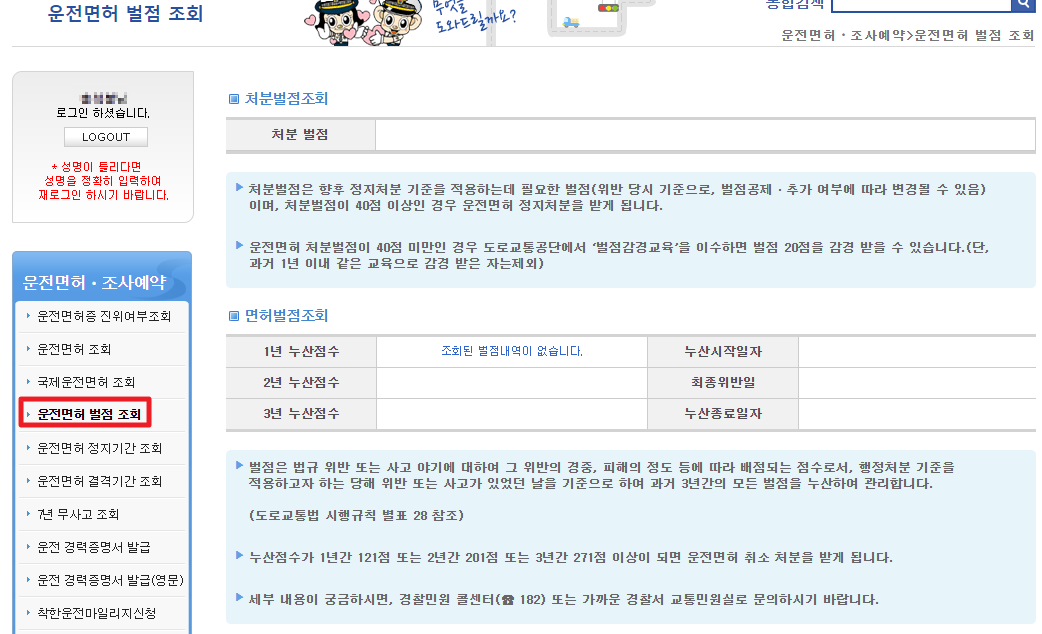 운전면허 조사예약에 들어 가면 운전면허 벌점 조회를 할수 있습니다. 위반을 자주 한다면 꼭 한번씩 접속 하여 운전면허 벌점 조회를 해야 합니다.