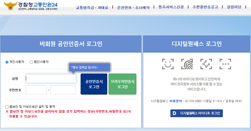 정보를 보기 위해서는 공인인증서 나 디지털원패스로 로그인을 할수 있습니다. 처음 접속을 했다면 간단한 보안 프로그램을 설치 하니 설치후 로그인을 하시면 될거 같아요.