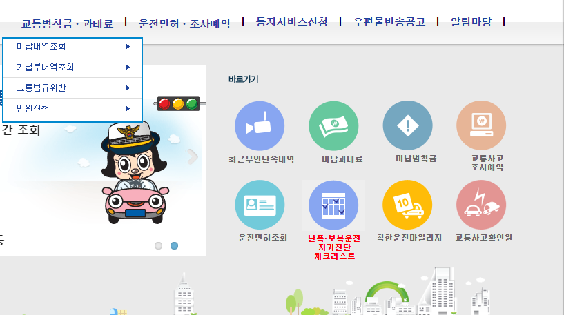 로그인을 한후 들어가면 자신의 정보로 최근 무인단속내역, 미납과태료, 미납범칙금, 교통사고 조사예약, 운전면허 조회, 난폭 보복운전 자가진단 체크리스트, 착한운전마일리지, 교통사고 확인원등 다양한 서비스를 확인 할수 있습니다.