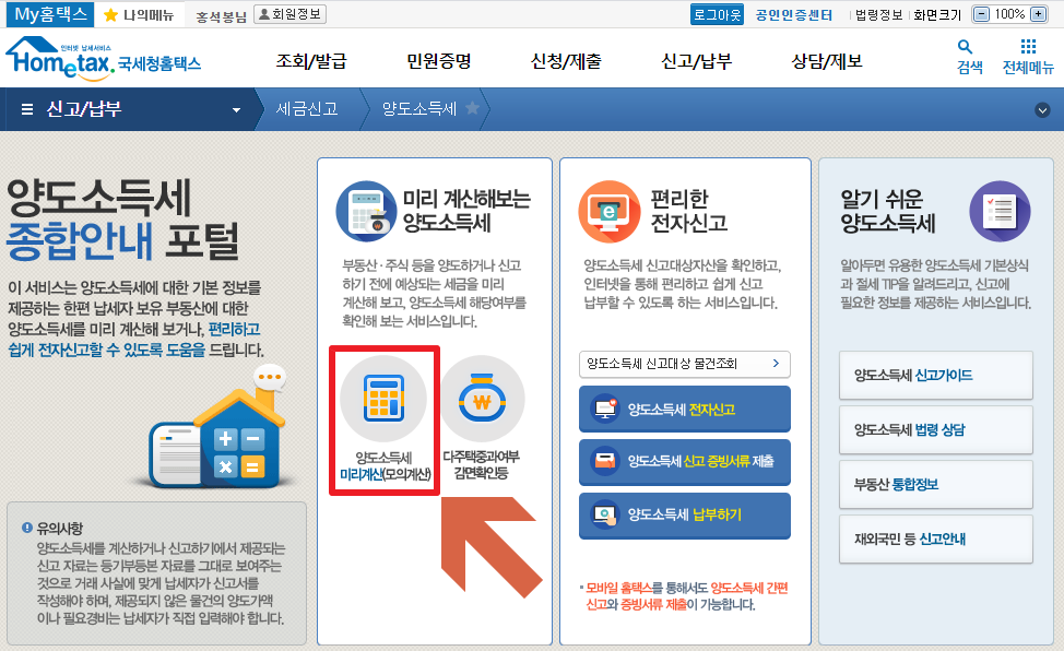 들어 가면 미리 계산해보는 양도소득세가 있습니다. 클릭해 주세요.
