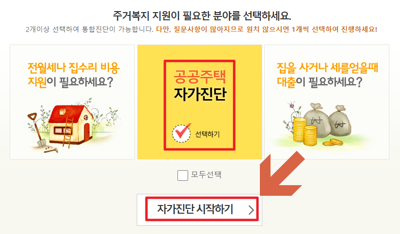 들어 가면 3가지 통합 진단을 할수 있습니다. 모두선택을 하면 전부 진단을 할수 있습니다. 여기서는 공공주택 자가진단만 해보겠습니다. 중간에 선택하기를 체크 하고 자가진단 시작하기를 클릭해 주세요.