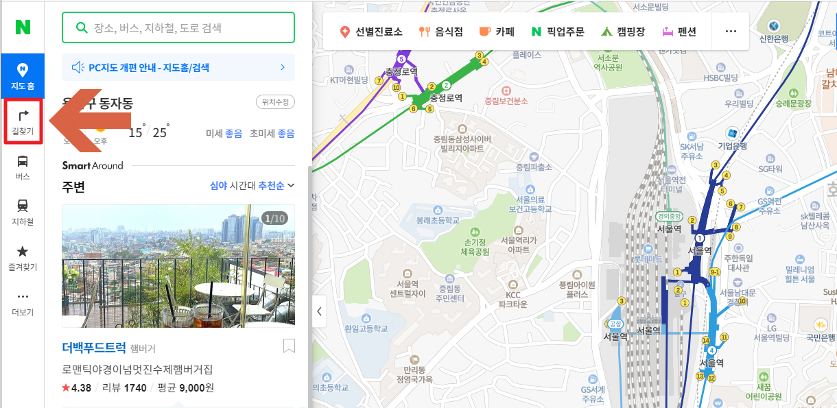 지도로 들어 가면 자신의 위치를 인식 하고 주변 지도를 보여 주는걸 볼수 있습니다. 지도 서비스 에서는 여러가지 정보를 알수 있습니다. 지도 서비스로는 길찾기, 버스, 지하철 등을 알수 있고 주변에 있는 음식점, 카페, 픽업주문, 캠핑장, 펜션, 편의점, 주차장 등을 한눈에 알수 있게 구성 되어 있습니다.