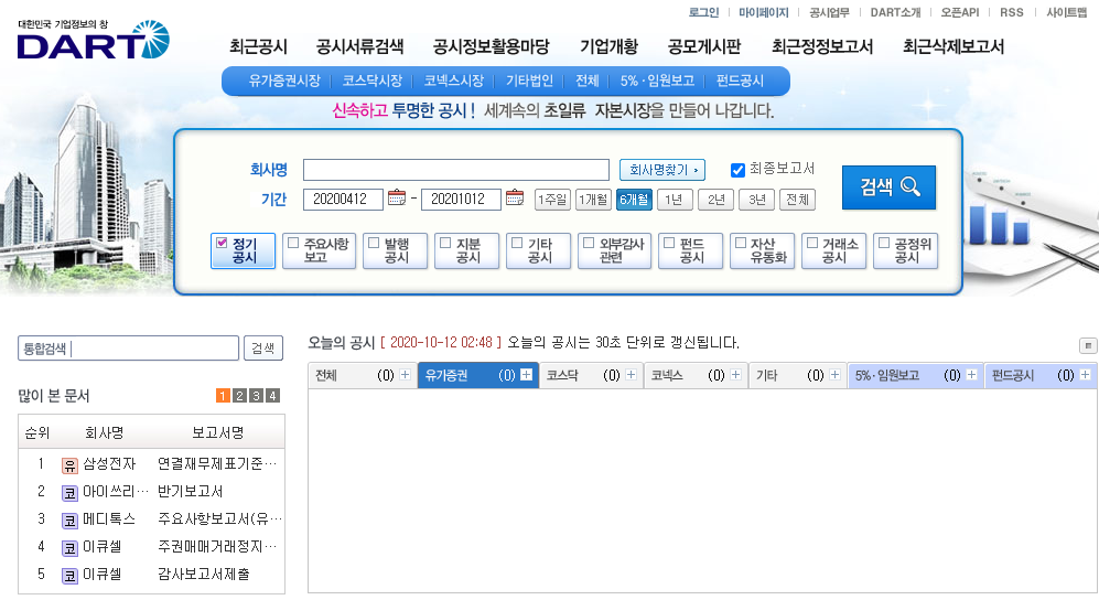 홈페이지로 들어 가면 최근공시, 공시서류검색, 공시정보활용마당, 기업개황, 공모게시판, 최근정정보고서, 최근삭제보고서 등으로 카테고리가 구성 되어 있는걸 볼수 있습니다.
