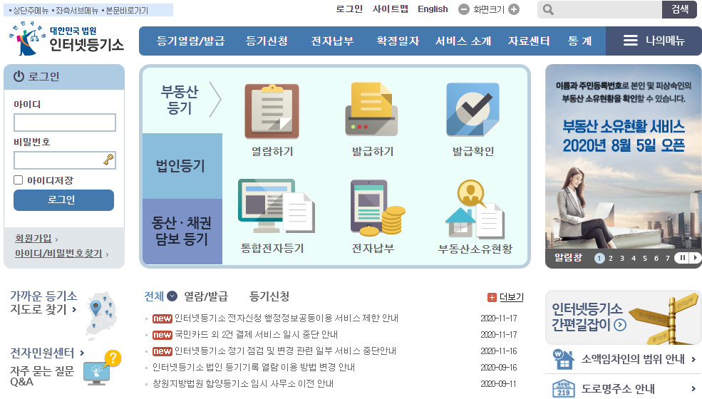등기열람과 발급도 가능 하니 필요하신 분들은 이용 하시면 될거 같습니다.