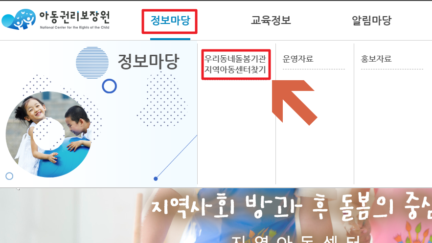 정보마당 -> 우리동네돌봄기관 지역아동센터찾기 에서는 우리동네 지역아동센터 찾을수 있습니다.