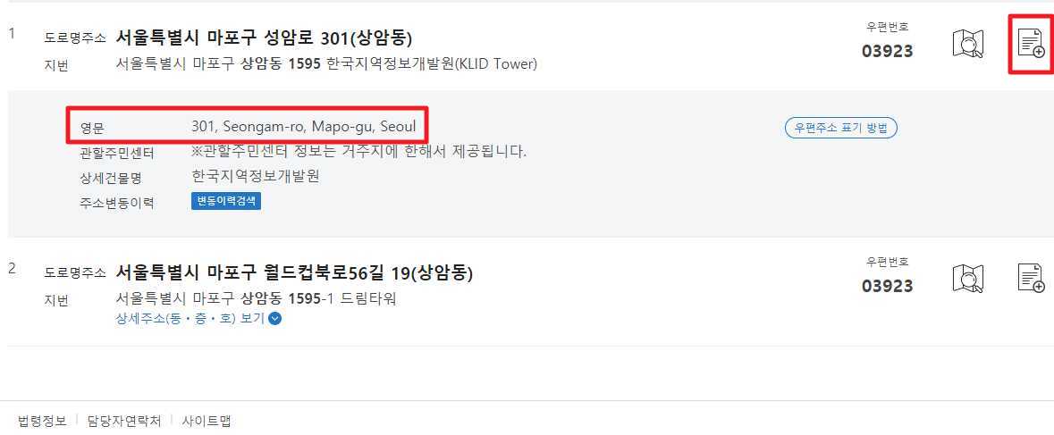 도로명주소 검색 으로 상세 주소를 알수 있고 도로명주소 우편번호찾기 까지 가능 한걸 볼수 있습니다. 오른쪽 끝에 있는 추가 정보 펼치기 클릭 하면 영문주소도 볼수 있습니다. 클릭해 보세요.